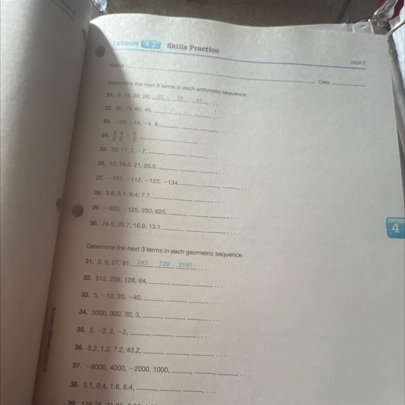 in the 2nd example they’re subtracting by 15 so continue this pattern in the blanks.