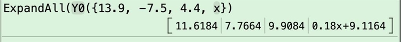 As above, this can be rearranged to give the slope-intercept form. This rearrangement is accomplished by the "ExpandAll" function in the attachment, which simplifies the function value 0.18(x-5.52)+10.11 to 0.18x+9.1164 for Y0(x).