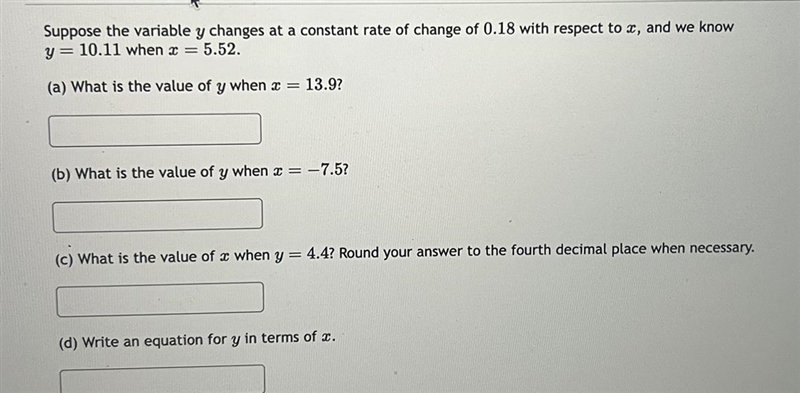You want various function values and the equation for a relation with a constant rate of change of 0.18 and the value 10.11 when x = 5.52.