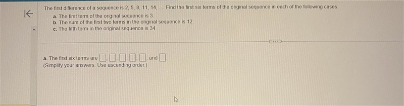 To find the first six terms of the original sequence, you can start with the first term, which is given as 3, and then add the corresponding differences successively: