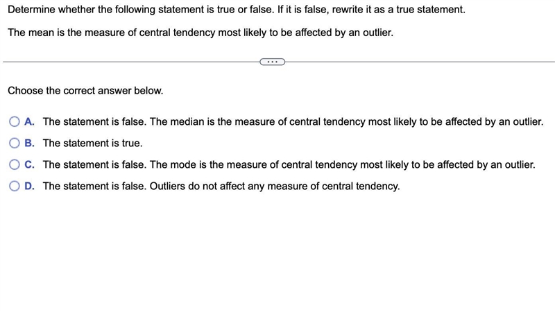 True. The mean is the only measure of central tendency that is affected by outliers.