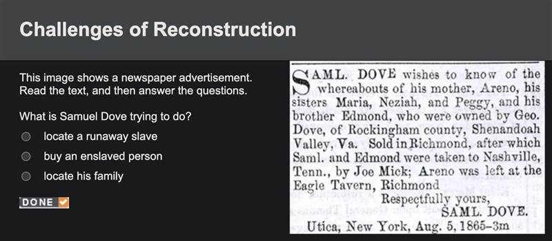 This image shows a newspaper advertisement. Read the text, and then answer the questions. What is Samuel Dove trying to do? a- locate a runaway slave b- buy an enslaved person c…