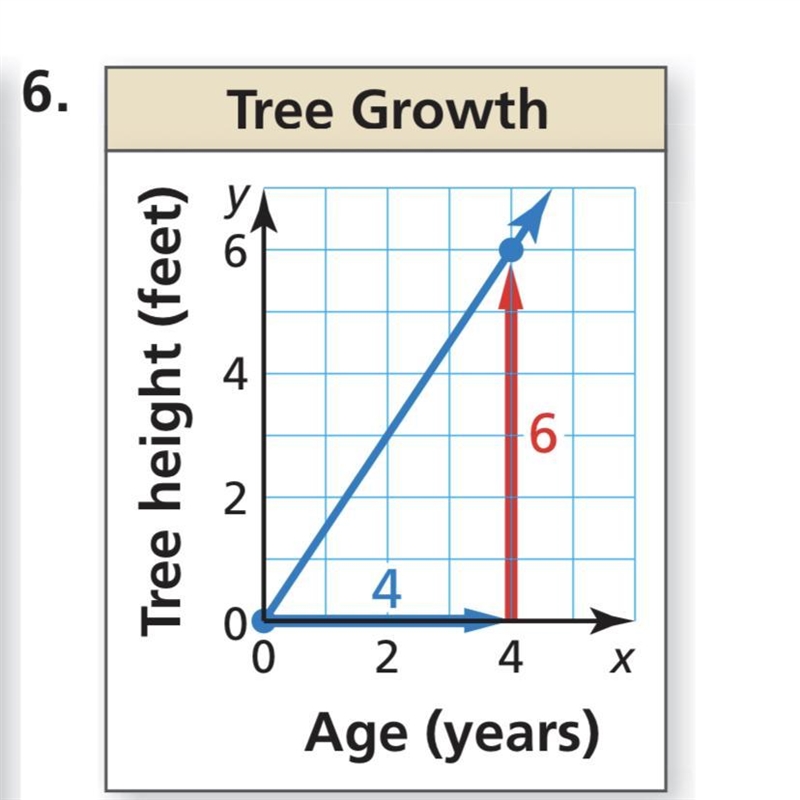 In this case, the rise is 6 and the run is 4, so we can calculate the slope (m) as: