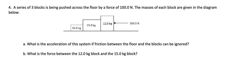 - So, the force between the 12.00 kg and 15.00 kg blocks is also 100.0 N, and it acts in the same direction as the applied force.