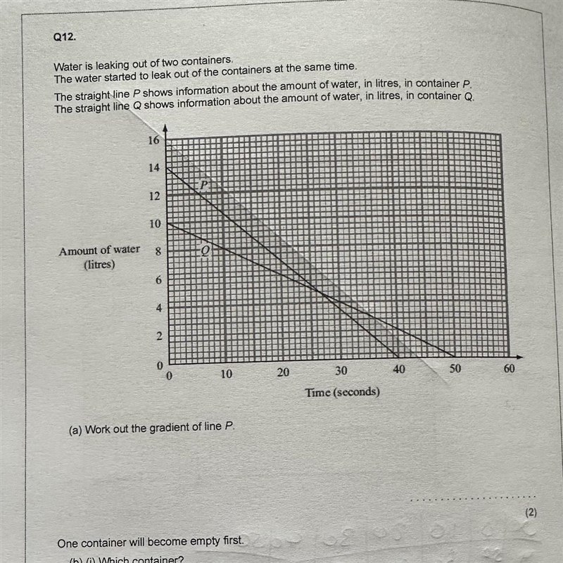 (ii) Once you have the gradient for line Q, you can calculate how much water is left in the other container when one becomes empty by using the formula: