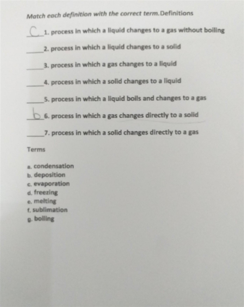 Match each definition with the correct term. Definitions 1. process in which a liquid changes to a gas without boiling 2. process in which a liquid changes to a solid 3. process in which a gas changes to a liquid 4. process in which a solid changes to a liquid 5. process in which a liquid boils and changes to a gas b6. process in which a gas changes directly to a solid 7. process in which a solid changes directly to a gas Terms a. condensation b. deposition c. evaporation d. freezing e. melting f. sublimation g. boiling​