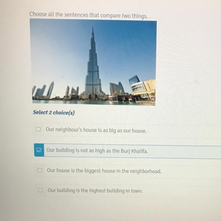 The first choice compares the neighbors house with your house and the second choice compares the building to the Burj Khalifa.