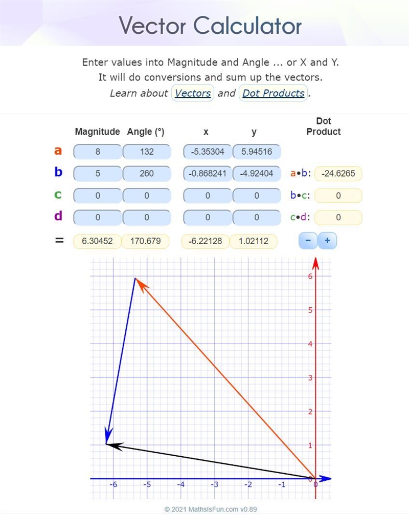 So, the resultant vector has a magnitude of approximately 8.704 and an angle of approximately -29.76 degrees. Note that the negative angle means it's measured clockwise from the positive x-axis.