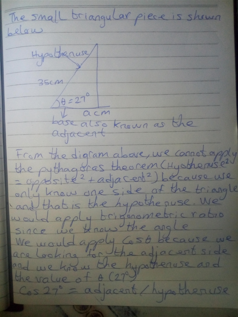 A small triangular piece of metal is needed to add support to a bicycle frame. The piece has a hypotenuse that is 18 inches in length. If the angle θ , is the angle between the hypotenuse and the base a, and known to be 49∘, what is the length of a to the nearest tenth of an inch? Round to one decimal place.