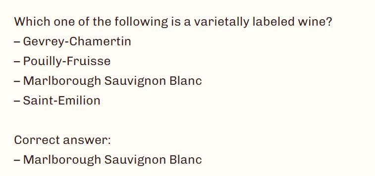Which ONE of the following is a varietally labeled wine? a) Gevrey-Chambertin b) Pouilly-Fuissé c) Marlborough Sauvignon Blanc d) Saint-Emilion