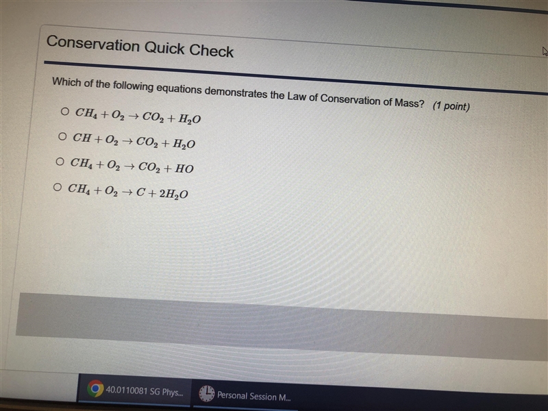 The law of conservation of mass states that mass is neither created nor destroyed in a chemical reaction. In other words, the total mass of the reactants (CH4 and O2) must be equal to the total mass of the products (CO2 and H2O) in a balanced chemical equation.