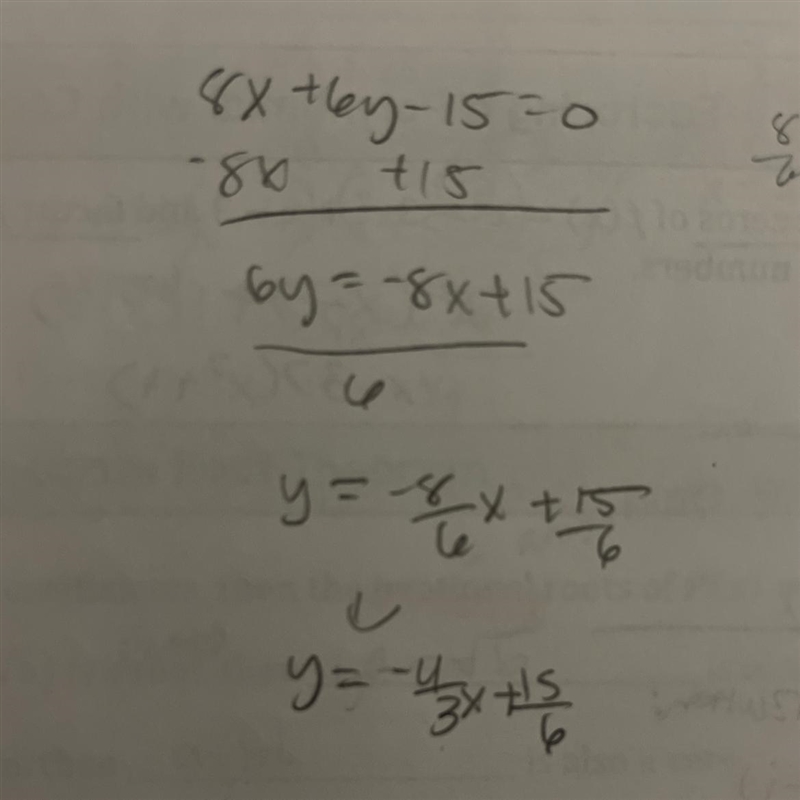 The equation of a line 8x+6y-15=0 in slope _intercept