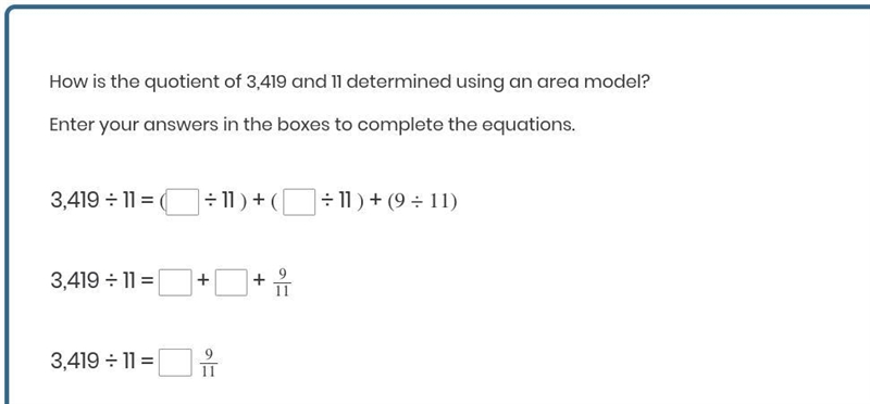 In order to determine the quotient of 3,419 and 11 by using an area model, we would have to express 3,419 as a combination of multiples of 11 as follows;