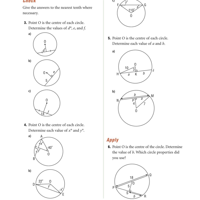 In 3a, this means angle d° is 90°. In 3b, this means e = 5, since the two halves of the chord have equal measures.