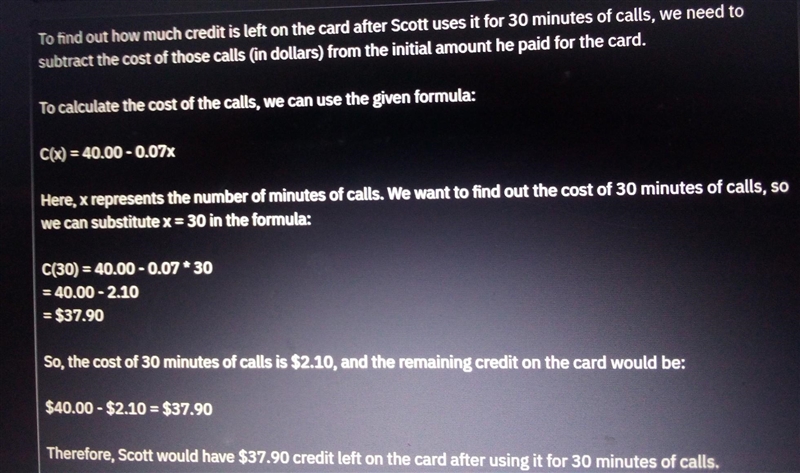 Scott purchased a prepaid phone card for $40.00. Calls cost 7 cents a minute using this ca minutes of calls is given by the following function. C(x)=40.00-0.07x How much credit …