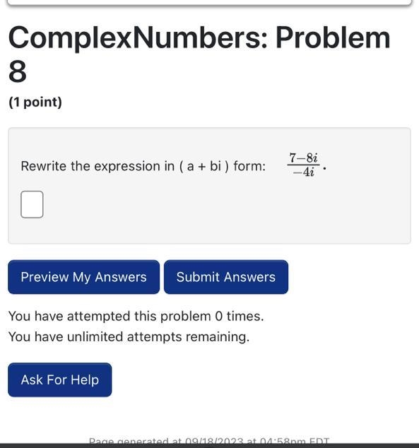 You want to write the value of (7 -8i)/(-4i) in the form a+bi.