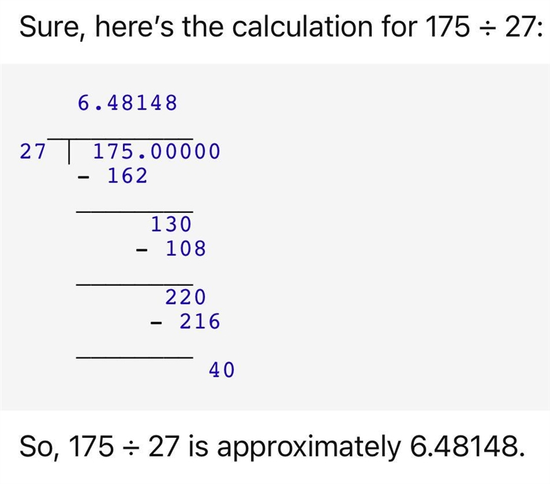 is approximately 6.4815. Please note that this is an approximation. The exact quotient of 175 divided by 27 is not a finite decimal. If you need more precision for specific calculations, it’s best to use the fraction form or a higher precision decimal.