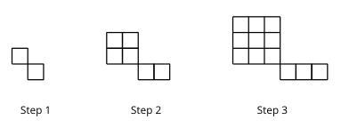 From the image description, it appears that the number of squares in each step forms a perfect square. In step 1, there are 2 squares (which is $$1^2 + 1$$), in step 2, there are 4 squares (which is $$2^2$$), and in step 3, there are 9 squares (which is $$3^2$$).