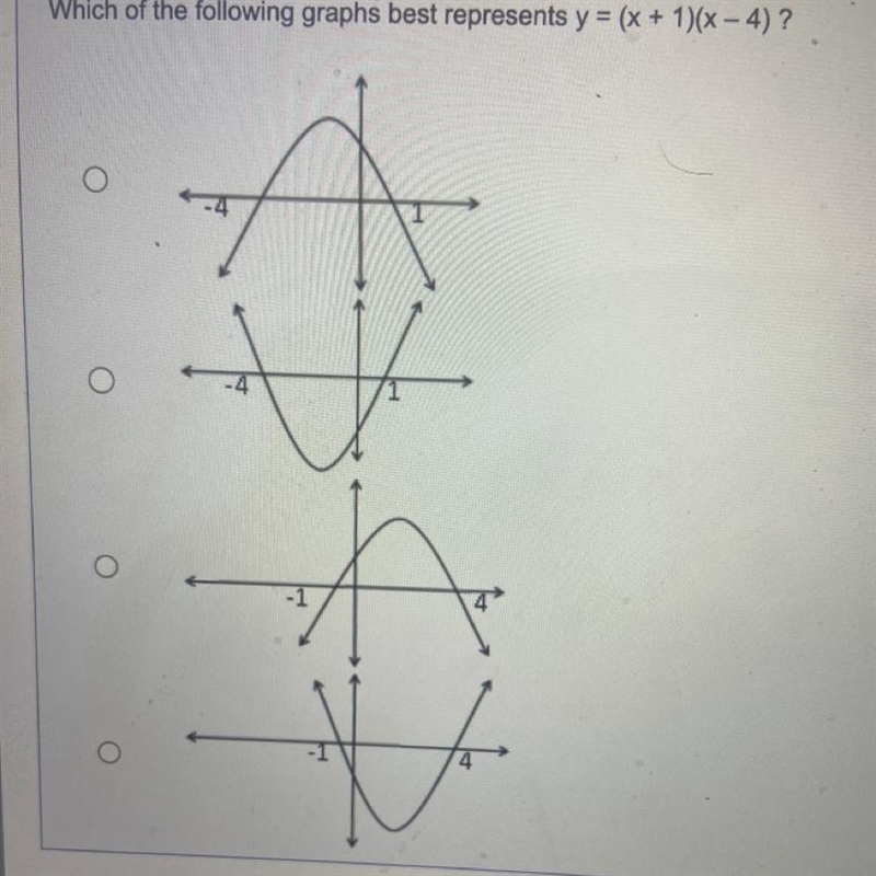 Which of the following graphs best represents y = (x + 1)(x - 4) ?