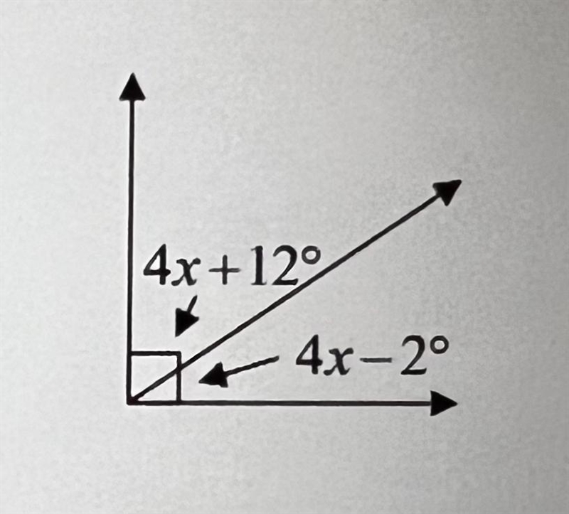 Using the picture below, write and solve an equation to find x. Then, find the measures of the two angles.