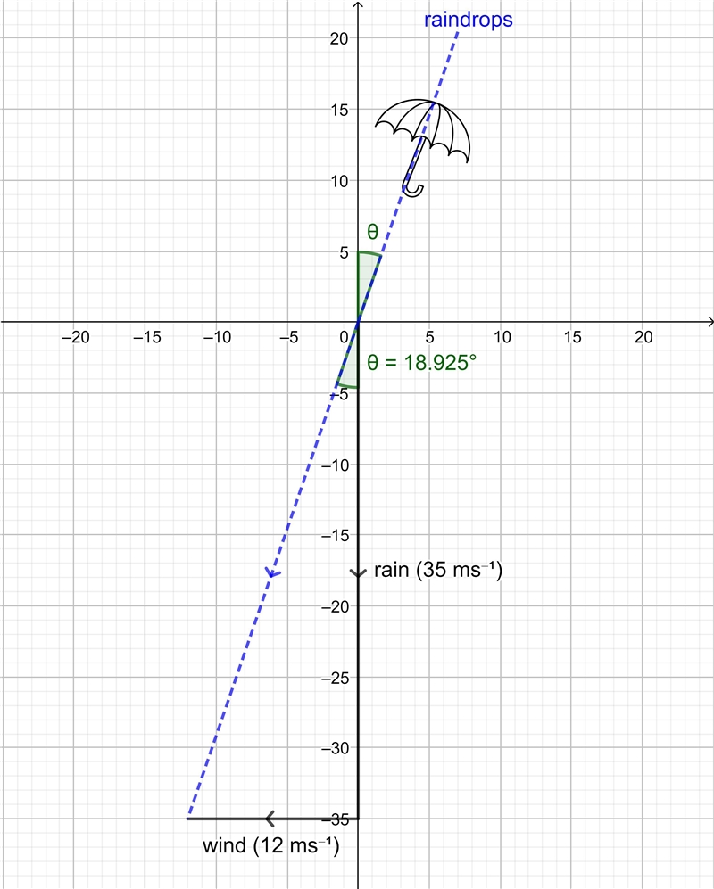 - vx is the horizontal velocity of the raindrops (which is 0 m s^-1 since they are falling vertically)