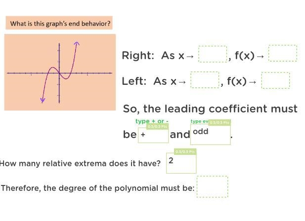 When the function is of odd degree, the sign of the leading coefficient multiplies the x-value to define the end behavior. Since the leading coefficient is positive, the end behavior sign matches the x behavior sign.
