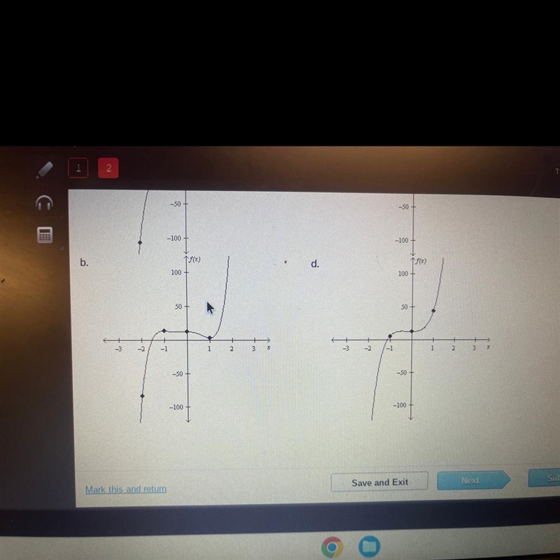 Graph the function f(x) = 7x³ + 4x² - 12x³ - 8x² +12 by making a table of values. Pay close attention to the scales on the axes. a. b. 100 50 -50 -100 100 11(x) 50- 2 3 C. d. -1…