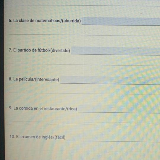 6. La clase de matemáticas/(aburrida) 7. El partido de fútbol/(divertido) 8. La pel-example-1
