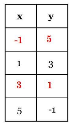 (\stackrel{x_1}{-1}~,~\stackrel{y_1}{5})\qquad (\stackrel{x_2}{3}~,~\stackrel{y_2}{1}) \\\\\\ \stackrel{slope}{m}\implies \cfrac{\stackrel{\textit{\large rise}} {\stackrel{y_2}{1}-\stackrel{y1}{5}}}{\underset{\textit{\large run}} {\underset{x_2}{3}-\underset{x_1}{(-1)}}} \implies \cfrac{ -4 }{3 +1} \implies \cfrac{ -4 }{ 4 } \implies -1