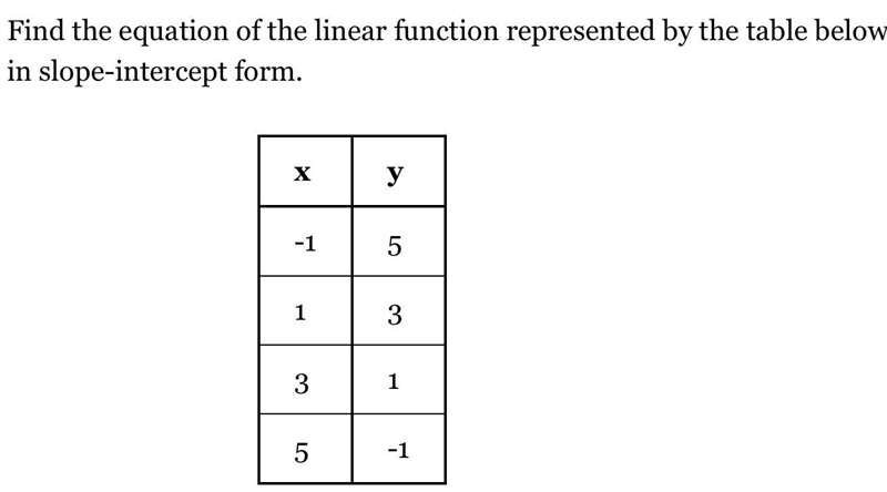 Find the equation of the linear function represented by the table below in slope-intercept form.