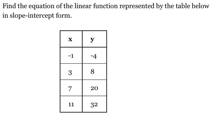 You want the linear equation describing the table with values (x, y) = (-1, -4) and (3, 8).