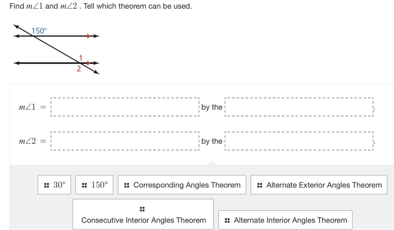 Pictographically, we can figure out that both m∠1 and m∠2 are equal to 150°, as they are both obtuse angles (greater than 90°), and the only other relevant answer choice (30°) is an acute angle (less than 90°).