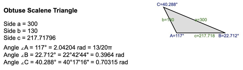 T = arcsin((t/s)sin(S)) = arcsin(130/300·sin(117°)) ≈ 22.7°