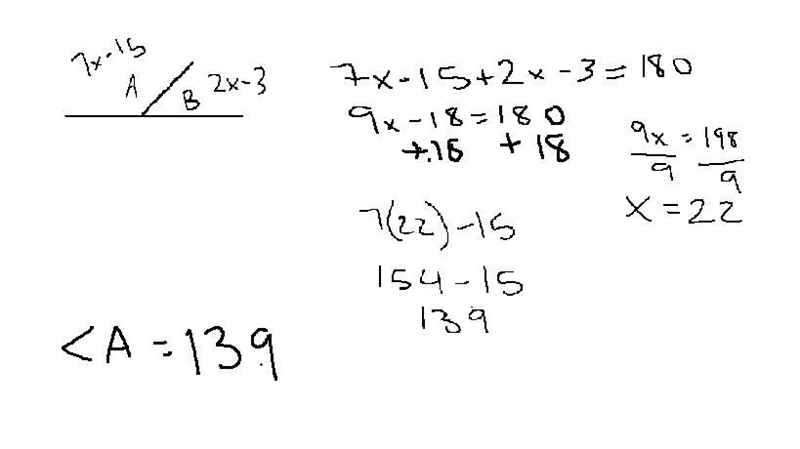 ∠A and ∠ B ∠B are supplementary angles. If m ∠ A = ( 7 x − 15 ) ∘ ∠A=(7x−15) ∘ and m ∠ B = ( 2 x − 3 ) ∘ ∠B=(2x−3) ∘ , then find the measure of ∠ A ∠A.