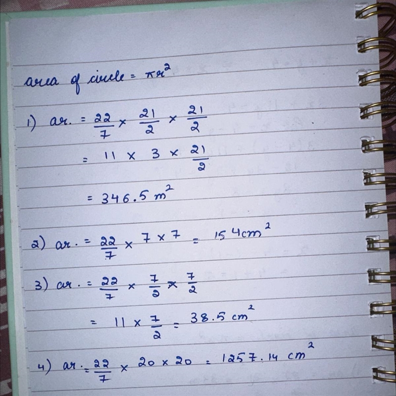 Find the area of the circle with the following dimensions 1) diameter 21 m 2) radius 7 cm 3) diameter 7 cm 4) radius 20 cm