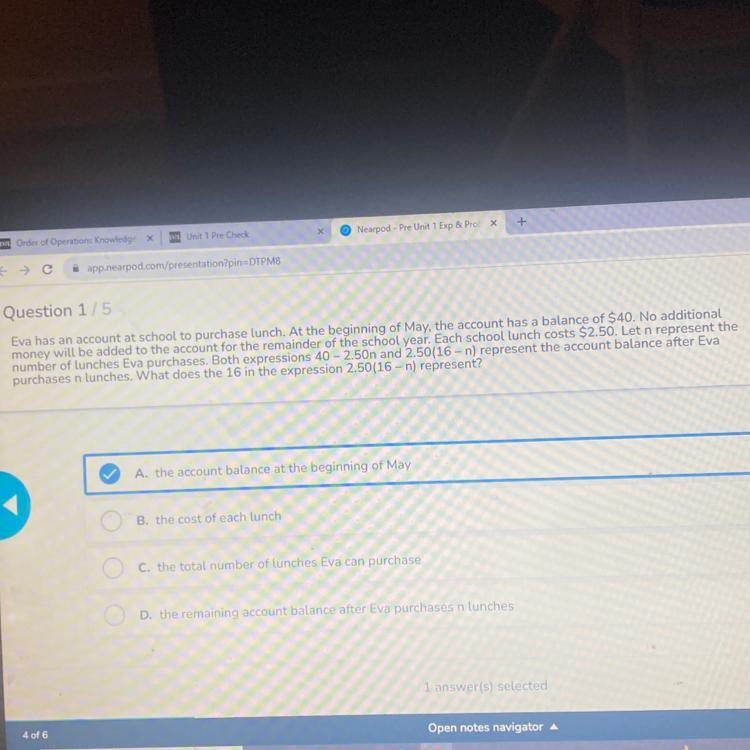 So, the \(16\) in the expression \(2.50(16-n)\) represents the number of lunches (or meal equivalents) that Eva can still purchase with her remaining account balance of $40 after she has purchased \(n\) lunches.