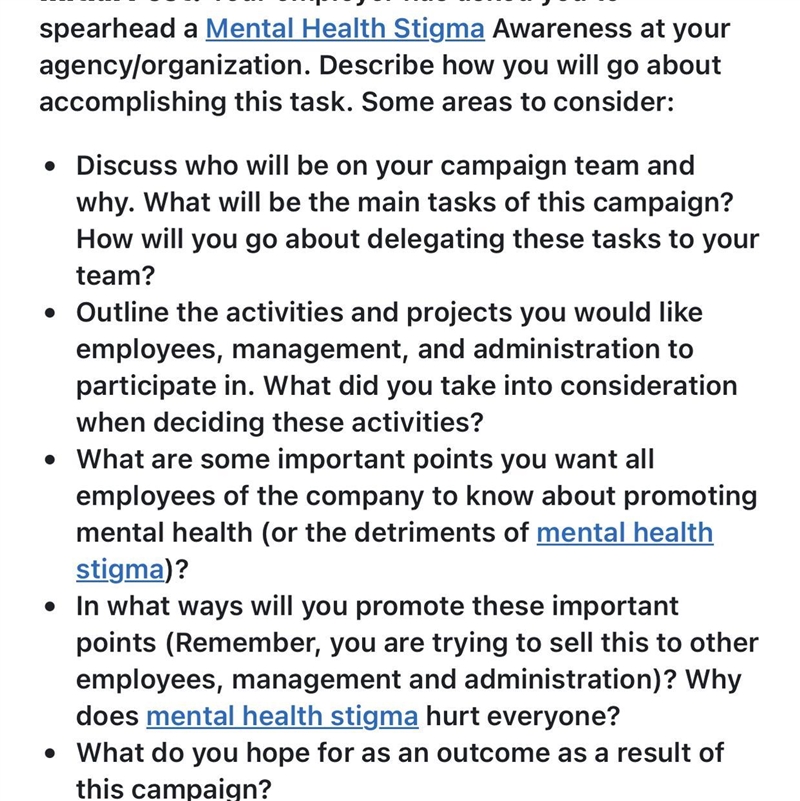 The goal of a mental health stigma campaign is to foster a culture of understanding, empathy, and support for mental health issues among employees, management, and administration. Here's a comprehensive plan for accomplishing this task: