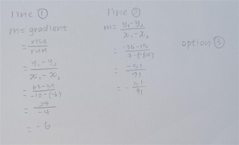 Step-by-step explanation: 63 - 39 / -10 - -16, 24/-4, -6 the slope for line 1 is -6