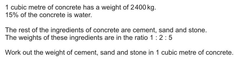 First find the weight of water in the concrete: 15% of 2400kg= 0.15 . 2400kg= 360kg. Now we find the weight of cement, sand and stone in the mixture: 2400kg - 360kg = 2040kg. Let’s find the total parts in the mixture: 1 part(cement) + 2 parts(sand) + 5 parts(stone) = 8 parts. Now we can find the weight of cement, sand and stone: 2040/8 = 255kg.