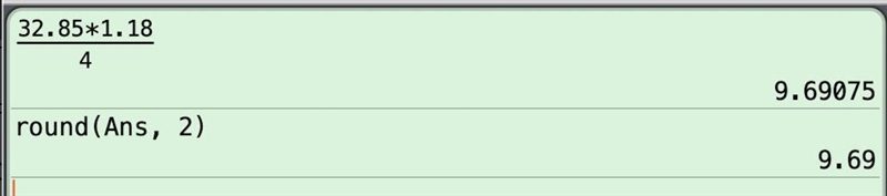 You want to know the value of each share of a bill of $32.85 after an 18% tip is added and the total is split 4 ways.