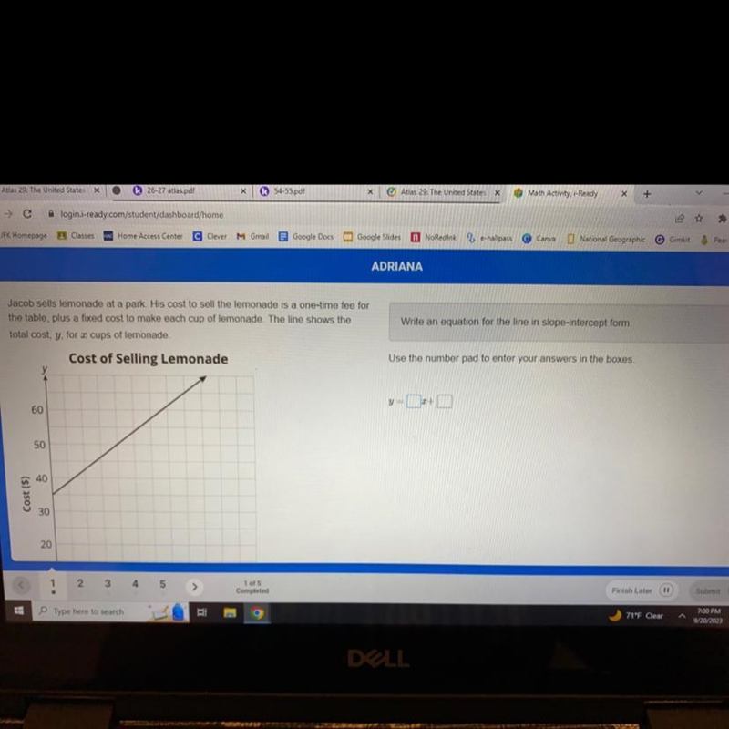 Jacob sells lemonade at a park. His cost to sell the lemonade is a one-time fee for the table, plus a fixed cost to make each cup of lemonade. The line shows the total cost, y, …