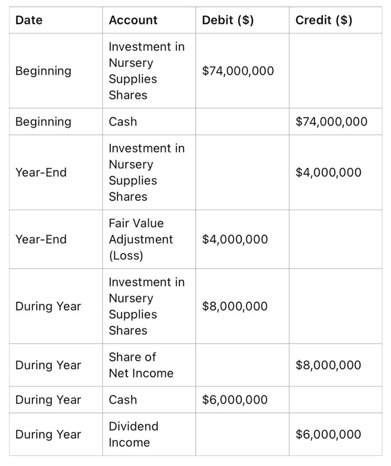 **Investment in Nursery Supplies Shares (Asset)**: Credit $4 million