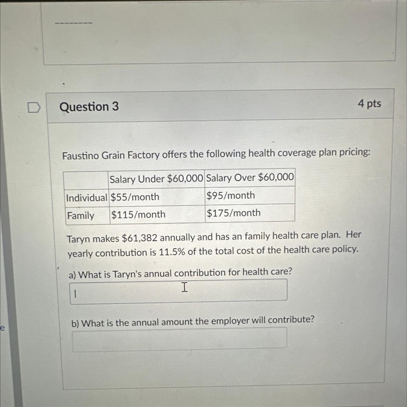 b) To find the annual amount the employer will contribute, we can subtract Taryn's contribution from the total annual cost. The total annual cost is $2,100, and Taryn contributes $241.50, so: