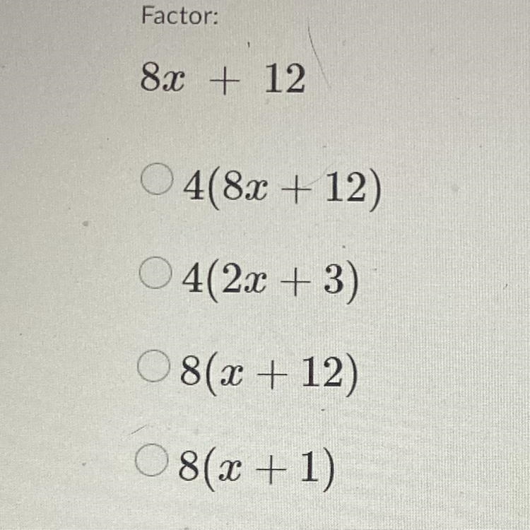 Both 4(2x + 3) and 8(x + 1) are correct factorizations of the expression 8x + 12.