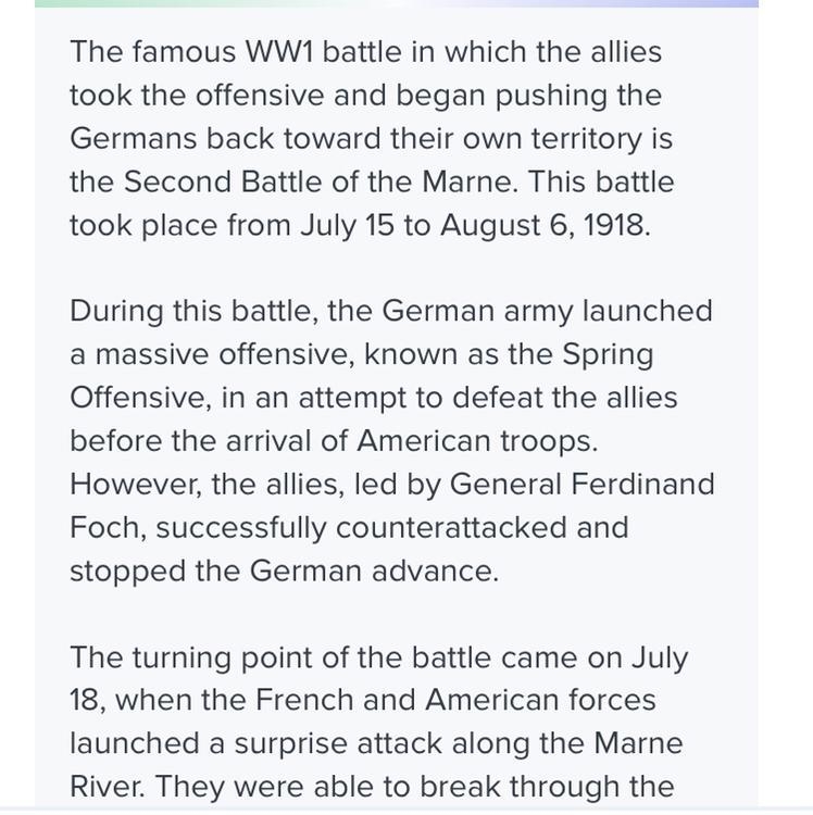 In which famous WW1 battle did the allies take the offensive and begin pushing the Germans back toward their own territory?