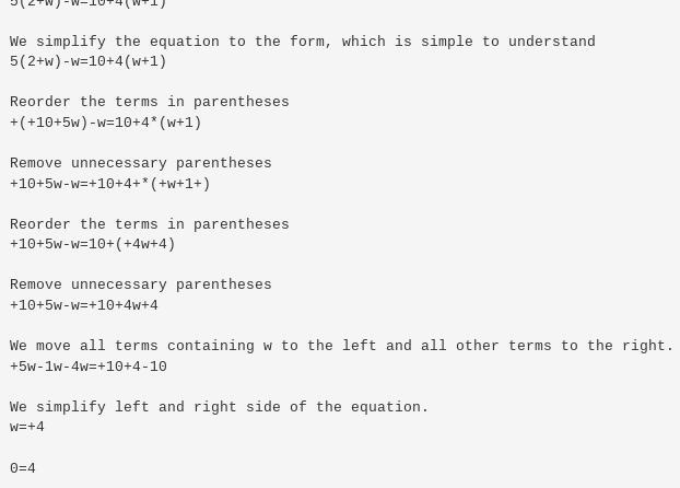 Answer:5(2 + w) - w = 10 + 4(w + 1)=0=4
