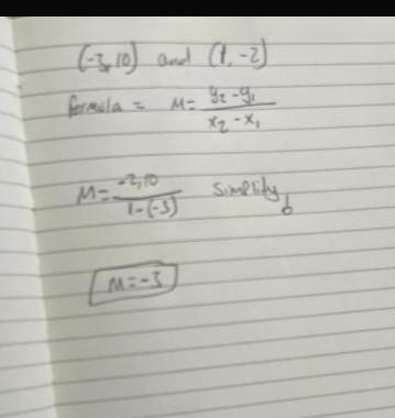 Slope is equal to the change in y over the change in x. In other words, subtract the first y coordinate from the second y coordinate, and divide that by the difference of the second x coordinate and the first x coordinate.