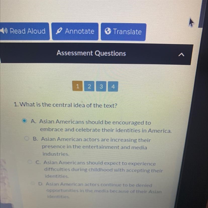 The correct answer is A (You did it right, don't worry). Jason Kim tells his personal story of how difficult it is to immigrate and to try to fit in with the people in your "new country" and even worries about what people with think of his culture, but later learns that no one, not even himself, should be ashamed of who they are or where they come from. (I'm taking the same quiz as you by the way!)