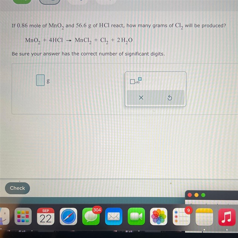 Rounded to the correct number of significant digits, the answer is approximately 110 g of Cl₂ will be produced.