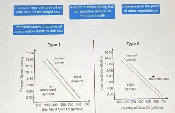 A new diet that prescribes only olive oil for weight loss is likely to increase the demand for olive oil, causing a rightward shift in the demand curve.
